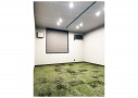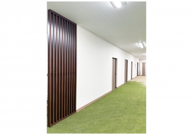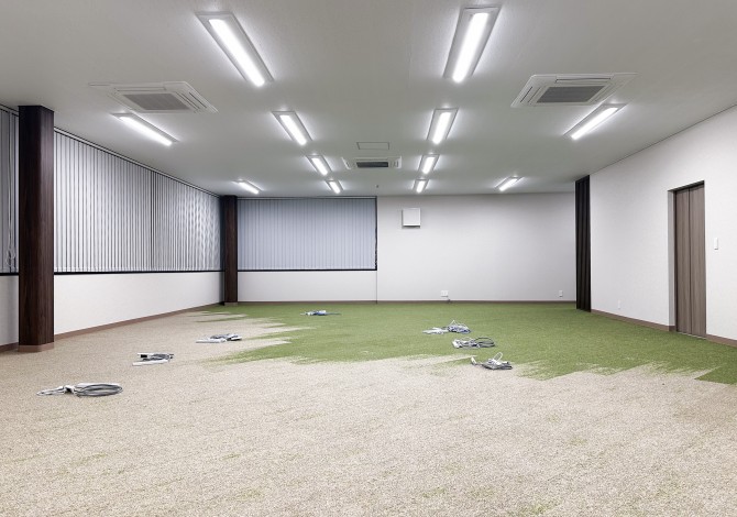 メインフロアは草原や土を想起させる グリーン・ブラウンのタイルカーペット Sangetsu チェンジオブシーンFグリーンを採用